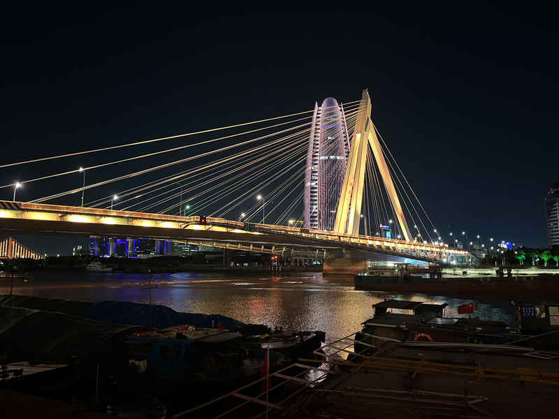 外灘大橋原名“驚駕路跨甬江大橋”,外灘大橋是寧波城區(qū)內(nèi)繼甬江大橋、慶豐橋之后又一座跨越甬江的特大型橋梁;該橋的建成,大大緩解甬江大橋、江廈橋和靈橋等的交通壓力,更加方便市民的出行。 外灘大橋主梁兩側(cè)向下懸挑伸出曲線的人行橋,宛如海鷗羽翼,簡(jiǎn)潔而輕靈。橋塔傾斜成“人”字形,寓指人文的寧波,著重表達(dá)寧波搏擊風(fēng)雨、勇往直前、具有海洋般寬闊胸襟的現(xiàn)代化花園城市形象。巨大有力的斜索塔看上去非常的有力,加上炬景照明燈光點(diǎn)綴與整個(gè)三江口整體的景觀燈光遙相呼應(yīng),很有魅力。